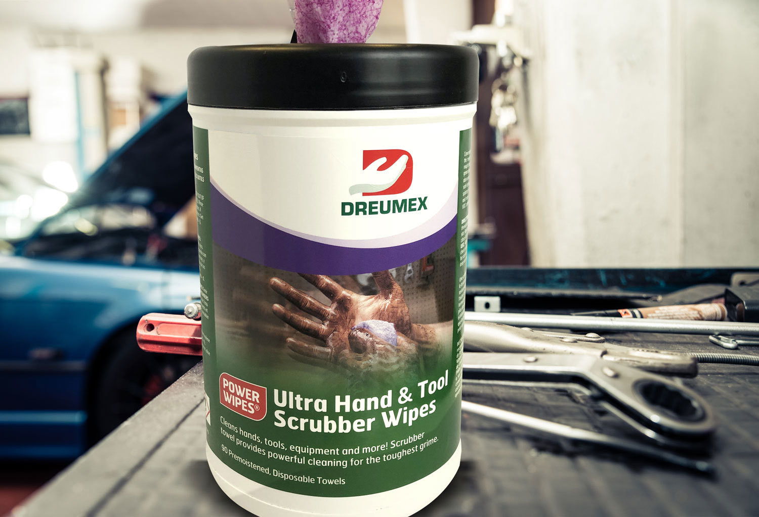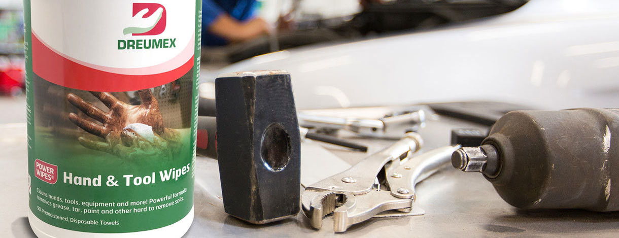 Dreumex Power Wipes® Hand & Tool Wipes and Dreumex Power Wipes® Ultra Hand & Tool Scrubber Wipes can be used as shop towels and hand wipes. And with Dreumex Power Wipes® Ultra Hand & Tool Scrubber Wipes, your clients get a unique dual-sided towel that will scrub tough grease off tools or grime on the skin.